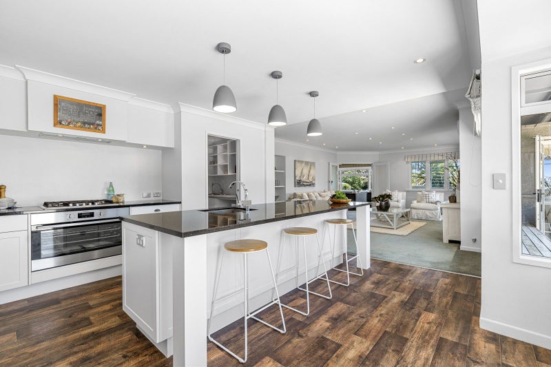 The ground floor apartment is a generous size with three extra large bedrooms, timber floors, French doors opening to a covered terrace, a refreshed kitchen, bathroom and open plan living. Upstairs, panoramic water views draw the eye from the large lounge with original ceiling and panelled walls with a free standing open wood fire for cosy winter nights. Dining is nestled into a sunny nook and the long deck accessed through wide French doors ensures effortless indoor/outdoor flow and seamless entertaining from the new kitchen, contemporary but sympathetic to the era of this home. There is a sky lit mezzanine, second bedroom with built in cabinetry, tiled family bathroom while down a hallway is the master suite with stylish ensuite, expansive dressing room and French doors opening to a peaceful pebbled courtyard complete with birdbath. This is luxurious refuge for any time of the day. The bijou single bedroom apartment is completely self-contained but could also be a guest suite, or for teenagers seeking independence.
